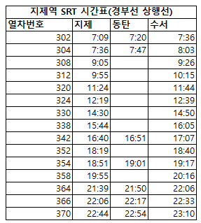 | 열차번호 | 지제 | 동탄 | 수서 |